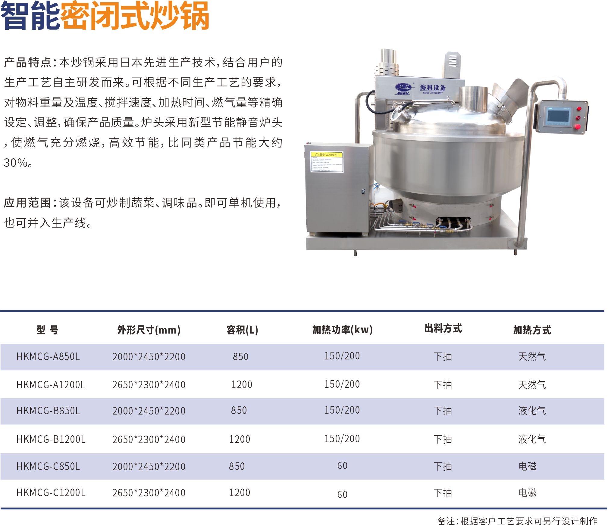 本炒锅采用日本先进生产技术,结合用户的生产工艺自主研发而来。可根据不同生产工艺的要求,对物料重量及温度、搅拌速度、加热时间、燃气量等精确设定、调整,确保产品质量。炉头采用新型节能静音炉头,使燃气充分燃烧,高效节能,比同类产品节能大约30%。