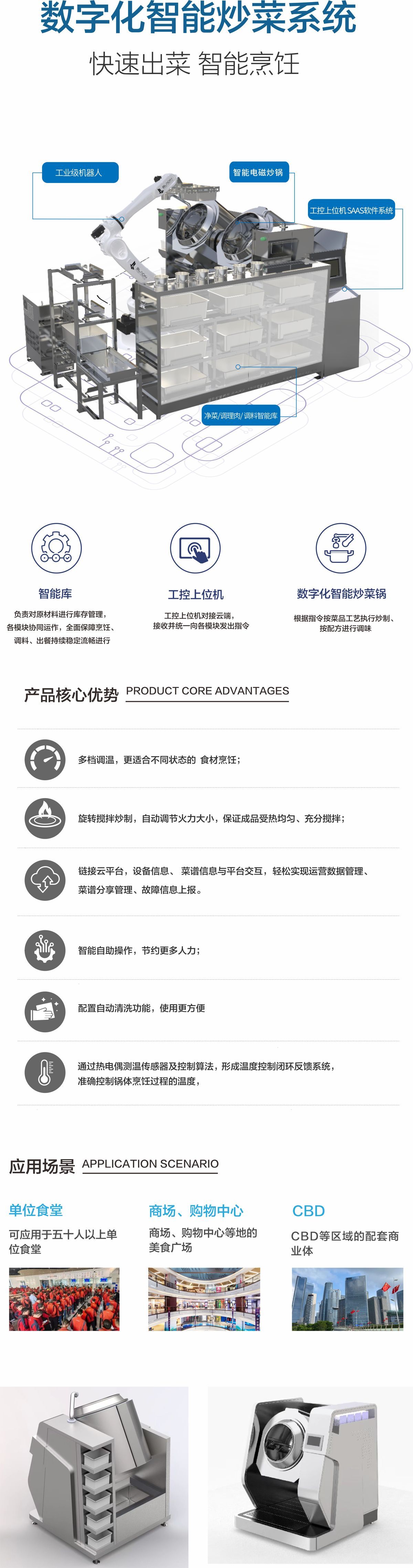 可用于集体用餐的食堂(机关、院校、工厂、中央厨房配餐中心等大型食堂)等场景量身打造的烹饪系统,主要由空盆/成品智能库、净菜/调理肉/调料智能库、工控上位机SaaS软件系统、数字化智能炒菜锅以及工业级机器人组成,工控上位机对接云端,接收并统一向各模块发出指令。